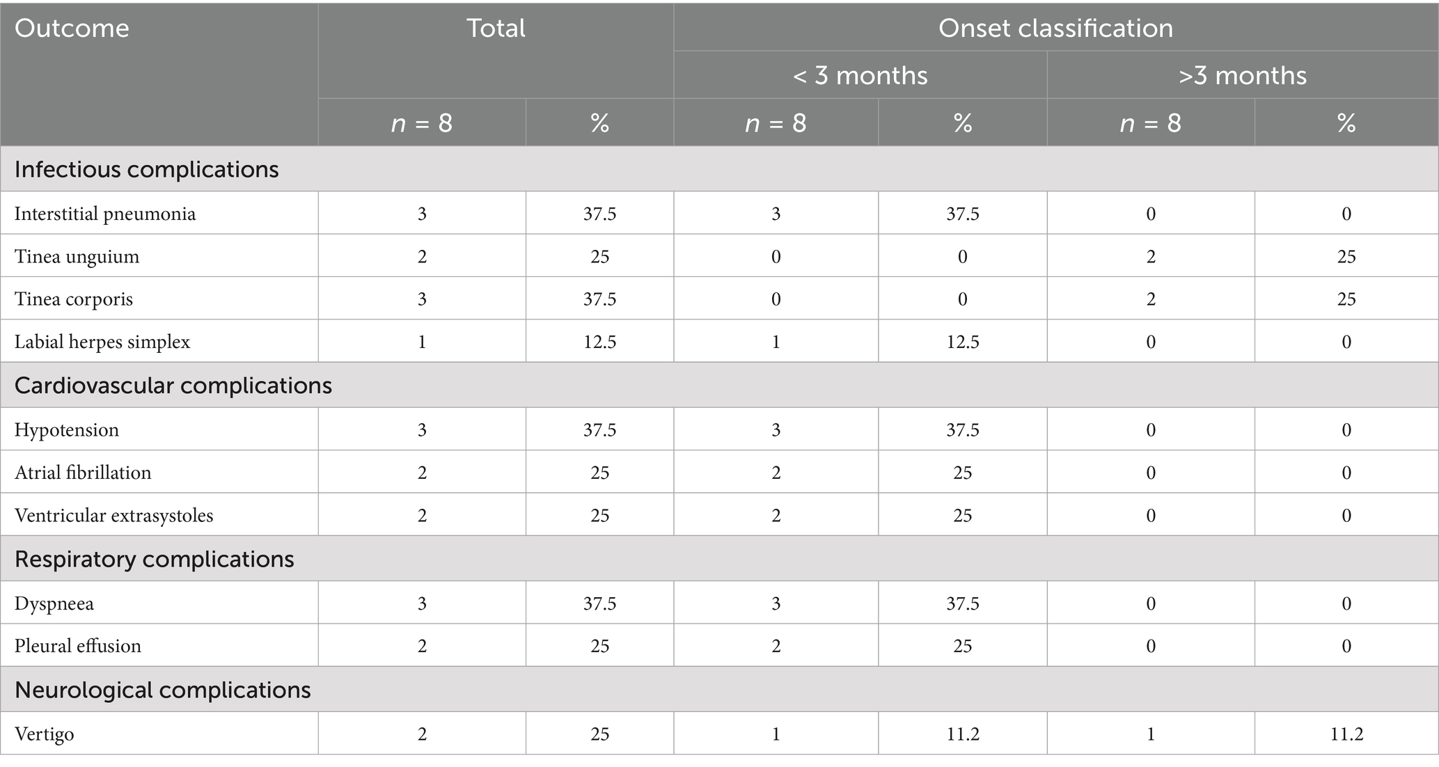 In the rituximab group, most adverse events occurred within the first 3 months of treatment. Infectious complications included interstitial pneumonia in 37.5% of patients (n = 3/8), all of which developed early, while fungal infections such as tinea unguium (25%, n = 2/8) and tinea corporis (37.5%, n = 3/8) appeared later during follow-up. Labial herpes simplex was documented in 12.5% (n = 1/8), with early onset. Cardiovascular complications were observed in a substantial proportion, including hypotension in 37.5% (n = 3/8), atrial fibrillation in 25% (n = 2/8), and ventricular extrasystoles in 25% (n = 2/8), all occurring during the early phase of therapy. Respiratory adverse events included dyspnea in 37.5% (n = 3/8) and pleural effusion in 25% (n = 2/8), both exclusively early-onset. Neurological manifestations were less frequent, with vertigo reported in 25% (n = 2/8), occurring both early (n = 1/8) and later (n = 1/8) during treatment.