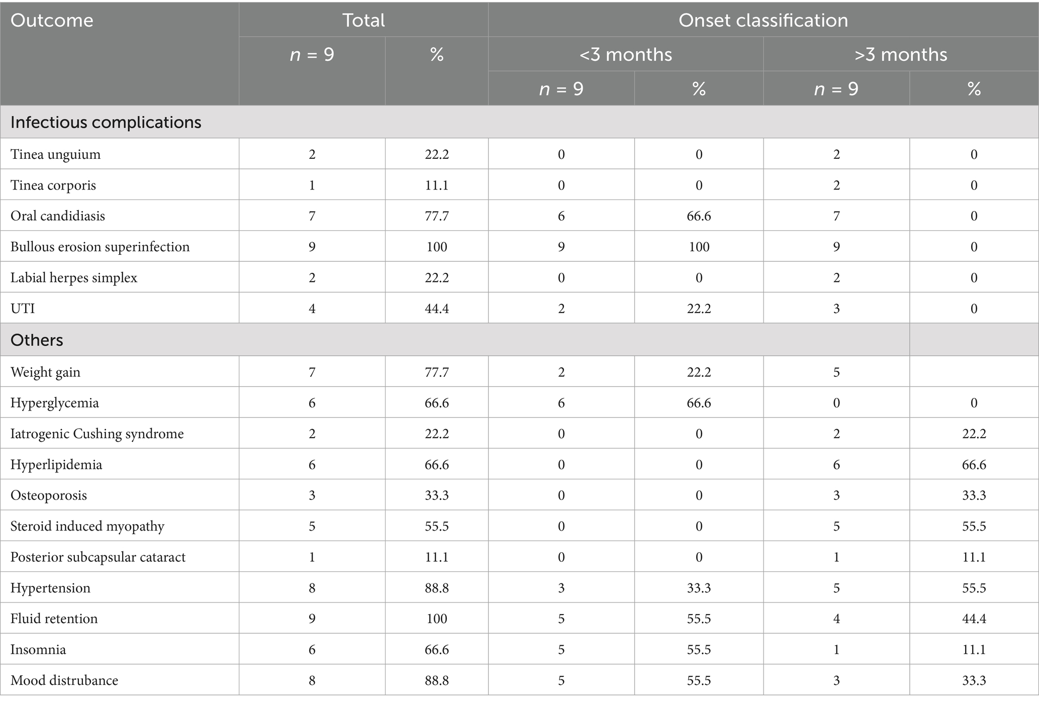 In the conventional therapy group, infectious complications were frequent. Oral candidiasis was reported in 77.7% of patients (n = 7/9), with most cases occurring within the first 3 months, and bullous erosion superinfection was universal (100%, n = 9/9), all of which developed early. Tinea unguium (22.2%, n = 2/9), tinea corporis (11.1%, n = 1/9), labial herpes simplex (22.2%, n = 2/9), and urinary tract infections (44.4%, n = 4/9) were also observed. Steroid-related adverse events were common and diverse. Weight gain was present in 77.7% of patients (n = 7/9), with both early (22.2%, n = 2/9) and late (55.5%, n = 5/9) onset. Hyperglycemia was reported in 66.6% (n = 6/9), exclusively within the first 3 months, while hyperlipidemia occurred in 66.6% (n = 6/9), osteoporosis in 33.3% (n = 3/9), steroid-induced myopathy in 55.5% (n = 5), and posterior subcapsular cataract in 11.1% (n = 1/9), all manifesting later in the course of treatment. Hypertension was detected in 88.8% (n = 8/9), with 33.3% early (n = 3/9) and 55.5% late onset (n = 5/9), while fluid retention was observed in all patients, more commonly during the first 3 months. Neuropsychiatric complications were also frequent, including insomnia in 66.6% (n = 6/9) and mood disturbances in 88.8% (n = 8/9), with most cases arising early in treatment.