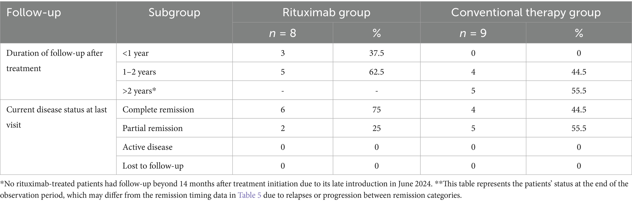 As shown in Table 8, follow-up duration differed between groups, with rituximab-treated patients having shorter observation times due to later therapy introduction. The duration of follow-up differed between groups. In the rituximab group, 37.5% (n = 3/8) were followed for less than 1 year and 62.5% (n = 5/8) for 1–2 years, with no patients exceeding 2 years of follow-up. In contrast, in the conventional therapy group 44.4% (n = 4/9) were followed for 1–2 years and 55.6% (n = 5/9) for more than 2 years. At the last visit, complete remission was documented in 75% (n = 6/8) of rituximab- treated patients and 44.4% (n = 4/9) of conventionally treated patients, while partial remission was observed in 25% (n = 2/8) and 55.6% (n = 5/9), respectively. None of the patients in either group had active disease at the last assessment, and no cases were lost to follow-up.