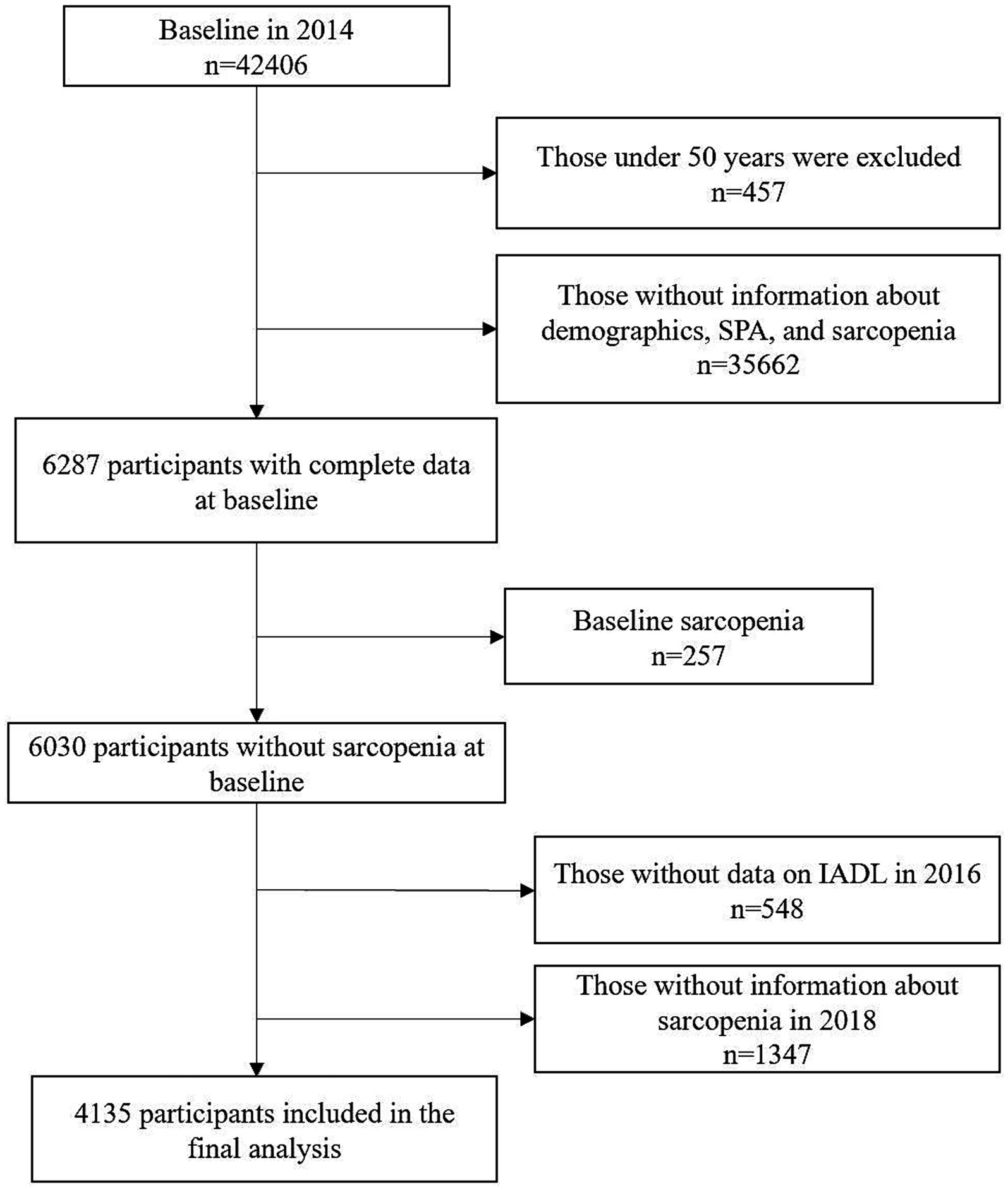 We obtained information from the 2014, 2016, and 2018 cycles of the HRS, in combination with the RAND HRS longitudinal file (18). These datasets were merged, resulting in a pooled sample of 42,406 respondents. IADL scores were extracted from the 2016 wave to ensure temporal separation between the exposure (SPA, measured in 2014), the mediator (IADL, measured in 2016), and the outcome (sarcopenia, assessed in 2018). Participants aged 50 and above who provided complete data on demographics, SPA, IADL, muscle strength, physical function, and muscle mass were considered eligible. A flow diagram illustrating the selection process and the number of exclusions at each step is presented in Figure 1.