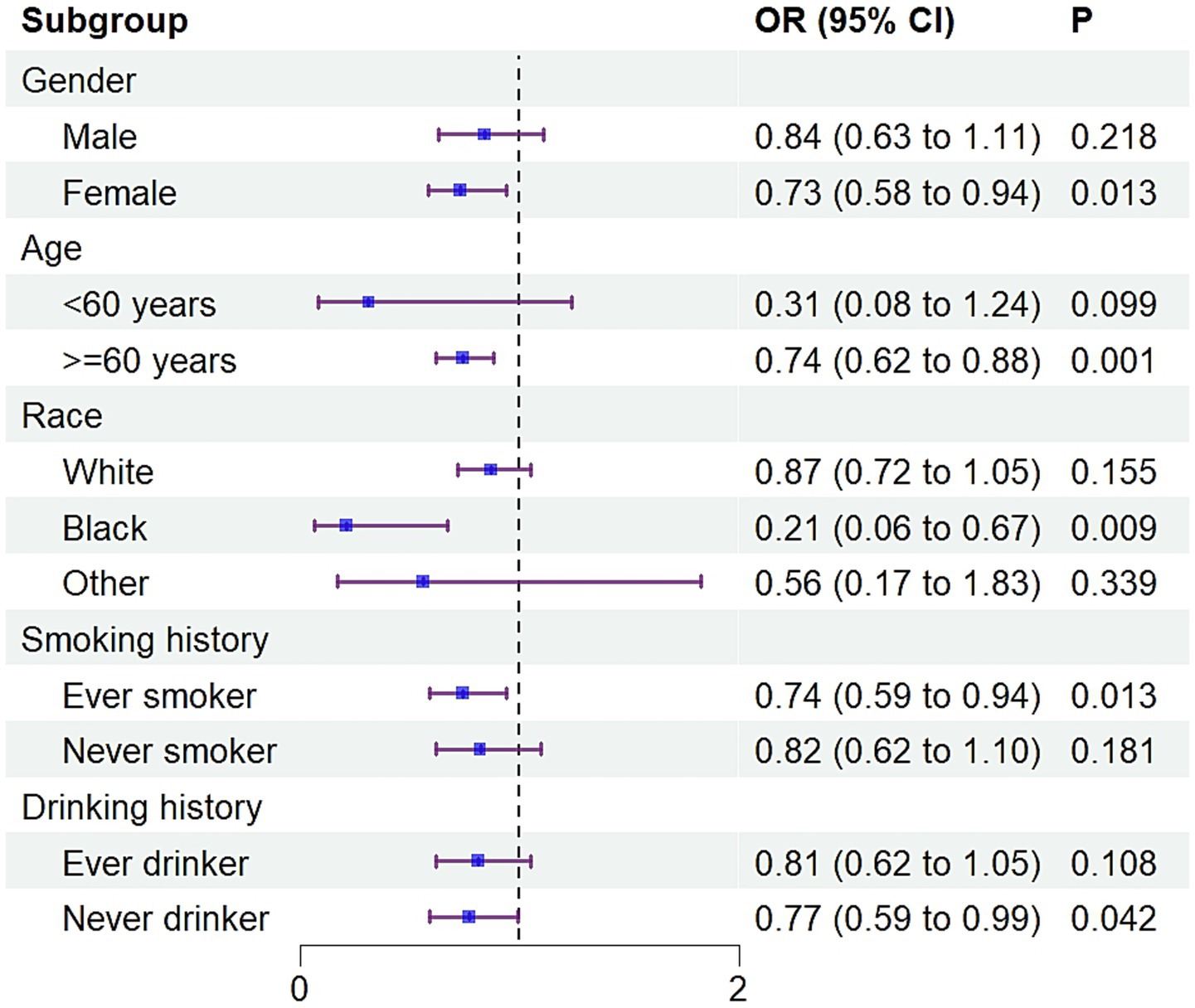 Analyses within subgroups showed a generally consistent negative relationship between SPA and sarcopenia across different strata. Statistically meaningful associations were identified in females (OR = 0.73, 95% CI: 0.58, 0.94), individuals aged 60 and above (OR = 0.74, 95% CI: 0.62, 0.88), and among Black participants (OR = 0.21, 95% CI: 0.06, 0.67). The association also held for those with a history of smoking (OR = 0.74, 95% CI: 0.59, 0.94) and without a history of drinking (OR = 0.77, 95% CI: 0.59, 0.99). No statistically significant associations were detected in other subpopulations (Figure 2).