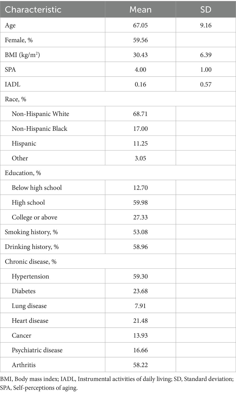 Descriptive analyses were conducted to describe the characteristics of the study cohort. Means and standard deviations were used to summarize continuous variables, whereas categorical data were described using counts and percentages. To investigate the link between SPA and sarcopenia and assess whether IADL mediate this relationship, generalized structural equation modeling (GSEM) was applied. This technique enabled concurrent estimation of both direct and indirect effects (27). In the mediation framework, SPA (from 2014) served as the independent predictor, IADL (from 2016) as the mediating variable, and sarcopenia status in 2018 as the outcome. Covariates were adjusted for in both modeling paths. To evaluate the indirect effects, bias-corrected confidence intervals (CI) were computed based on 5,000 bootstrap replications using a nonparametric approach. Statistical significance was defined as p < 0.05. All statistical analyses were carried out in Stata version 18.0. To confirm the stability of our results, sensitivity checks were performed. Further stratified analyses were done by gender (male/female), age group (<60 vs. ≥60), racial background, smoking behavior (ever/never), and alcohol use (ever/never). Forest plots were used to present subgroup-specific odds ratio (OR) and assess effect modification.