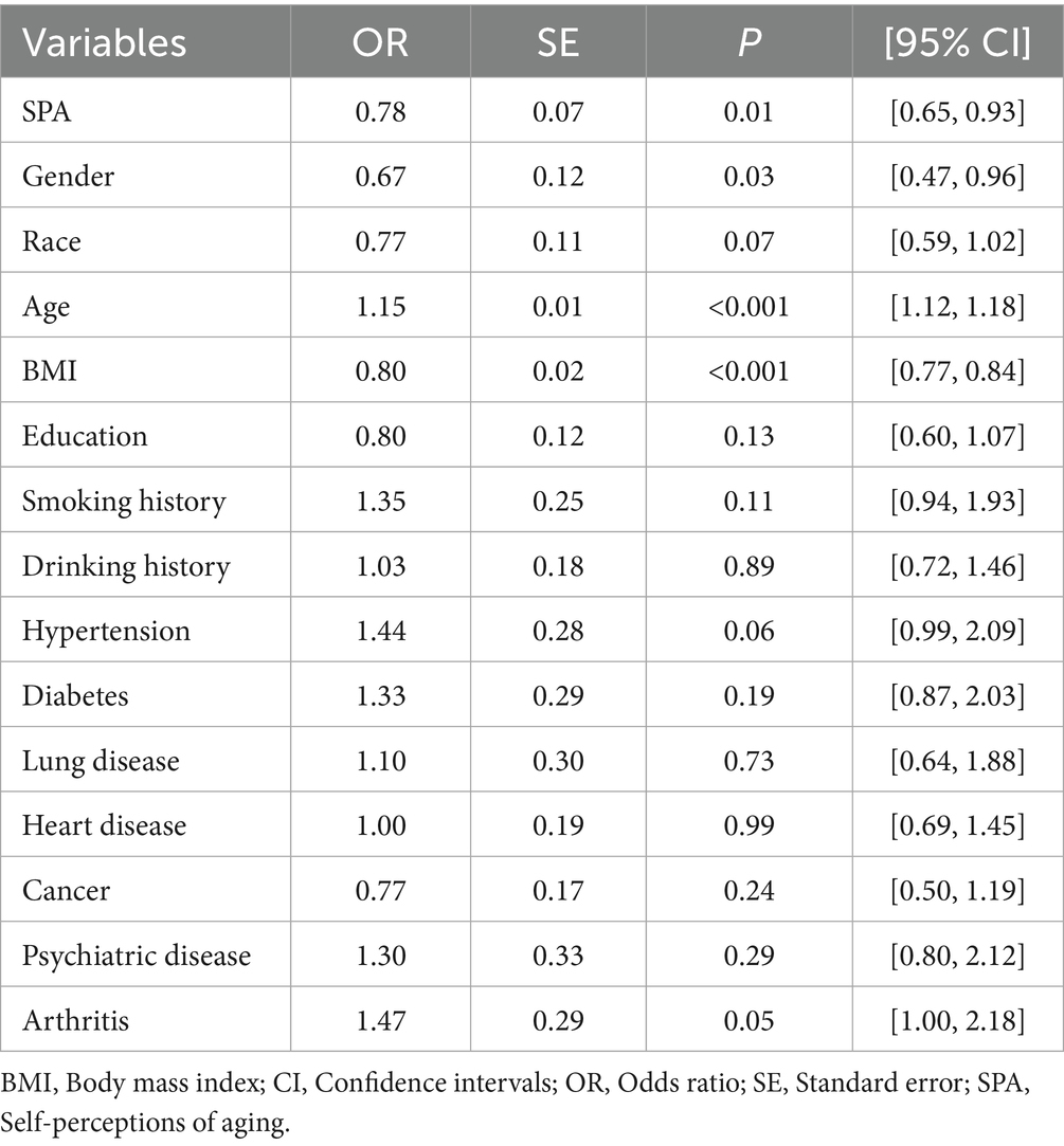 In the subgroup analyses, we observed notable heterogeneity in the association between SPA and sarcopenia across demographic and behavioral subgroups. The protective effect of positive SPA appeared to be more pronounced among women, older adults, individuals with a history of smoking, and those who abstained from alcohol. These patterns suggest that physiological and behavioral contexts may modulate the impact of perceptions of aging on muscle health. For example, women and older individuals generally experience greater vulnerability to physical frailty, which may heighten their sensitivity to psychosocial factors such as aging perceptions (53). Previous studies have shown that negative aging beliefs accelerate the progression of frailty, and that positive SPA is particularly predictive of physical performance in older women (54, 55). Similarly, smoking is a well-established risk factor for sarcopenia, with smokers having a two- to threefold greater risk than nonsmokers do (56). Individuals with such behavioral risk factors may rely more heavily on positive psychological resources, such as SPA, to buffer the adverse effects of these risks (57, 58). Conversely, abstaining from alcohol may reduce physiological stressors on muscle tissue. Heavy drinking has been associated with a nearly fourfold increase in the prevalence of sarcopenia among older adults. Healthier lifestyle patterns may allow positive aging perceptions to exert stronger protective effects (59, 60). The direction of association was similar across racial groups. However, significance appeared only among Black participants. This may reflect larger effect sizes, sociocultural differences in aging perceptions, or smaller sample sizes in other groups.