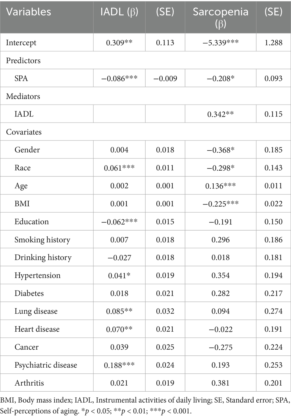 Conclusion: IADL may serve as a behavioral pathway linking SPA to sarcopenia. Promoting positive aging beliefs and functional independence could aid in sarcopenia prevention.