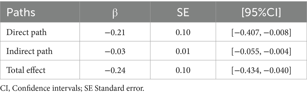 GSEM was applied to assess whether IADL served as a mediator in the relationship between SPA and sarcopenia (Table 3). The indirect effect of SPA on sarcopenia through IADL was statistically significant (β = −0.03, 95% CI: −0.055, −0.004, p = 0.021). The direct path from SPA to sarcopenia also remained significant (β = −0.21, 95% CI: −0.407, −0.008, p = 0.041), suggesting that SPA influenced sarcopenia both directly and indirectly. The total effect was robust and statistically significant (β = −0.24, 95% CI: −0.434, −0.040, p = 0.018), supporting the hypothesis that IADL serves as a meaningful behavioral pathway through which SPA affects muscle health in older adults (Table 4).