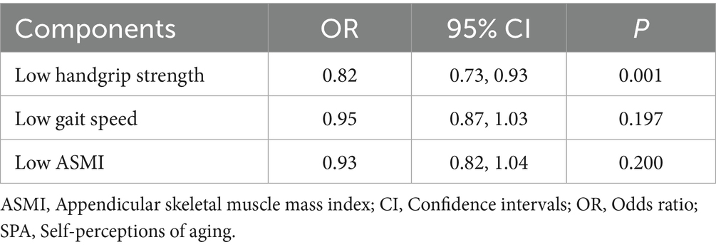 An important finding of this study is that SPA was significantly associated with grip strength but not with gait speed or muscle mass. These findings suggest that SPA may have different effects on the individual components of sarcopenia. Grip strength, as a marker of neuromuscular function, is closely linked to motivational and behavioral engagement in daily activities (41–43). Older adults with more positive perceptions of aging are more likely to maintain higher levels of physical activity and daily functional engagement, which can preferentially preserve or enhance muscle strength through regular use (11, 44). In contrast, gait speed is a complex physical performance measure that depends not only on muscle strength but also on balance, joint health, neurological control, and confidence (45–48). Positive self-perceptions alone may be insufficient to influence these multifactorial determinants without targeted mobility training or behavioral interventions. Similarly, muscle mass is largely determined by long-term metabolic and hormonal factors, and may not change significantly in response to psychological factors unless positive aging beliefs translate into sustained changes in exercise or dietary behaviors (49, 50). These findings suggest that SPA affects mainly functional strength. This domain is especially sensitive to behavioral and motivational factors. In contrast, gait speed and muscle mass appear to be less influenced by SPA. This interpretation is consistent with previous evidence highlighting that muscle strength, rather than mass, underpins physical performance and functional independence in older adults (51, 52).