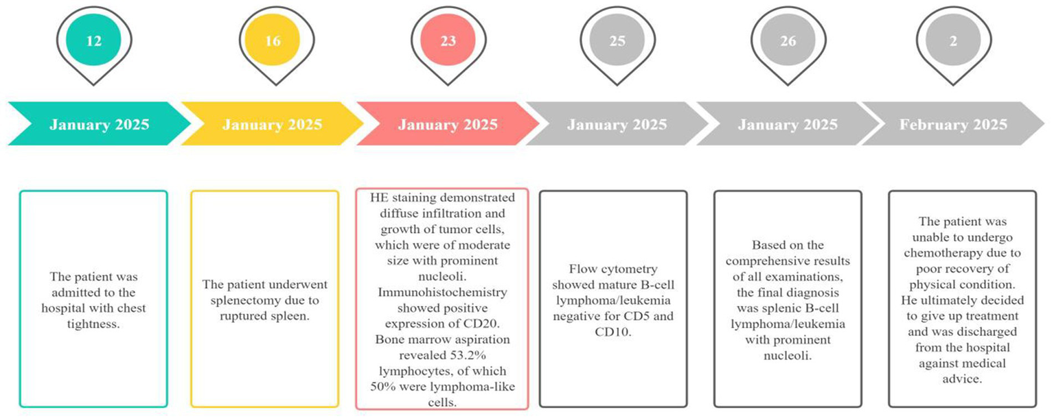 Re-examining the patients’ diagnosis and treatment, he was admitted to the hospital due to chest tightness and discomfort. Physical and imaging examinations revealed splenomegaly. While awaiting a definitive diagnosis of the disease, the patient experienced spontaneous splenic rupture and was given surgical treatment. The final diagnosis of SBLPN was ultimately confirmed via splenic pathological examination and bone marrow analysis. Unfortunately, the patient did not receive further chemotherapy, preventing follow-up on treatment outcomes for SBLPN.
