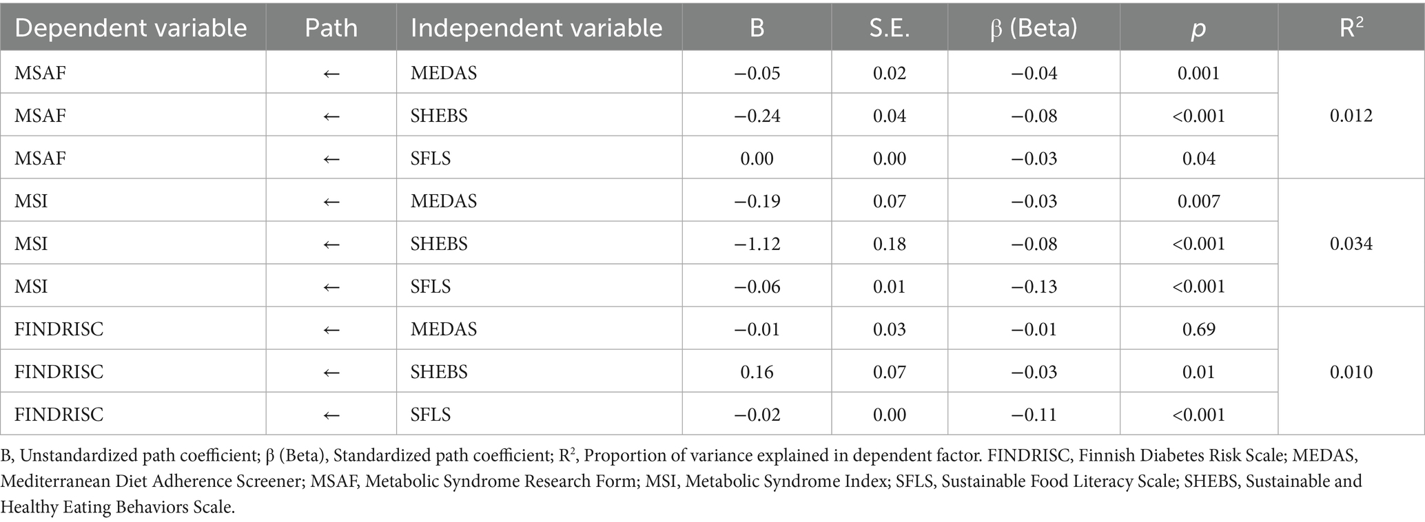 The findings of the path analysis determining the effect level are presented in detail in Table 5, and a visual representation of the general structure of the model and the relationships between variables is given in Figure 2. SFLS and MEDAS had a negative and significant effect on the MSAF (β = −0.03, β = −0.04; p < 0.05, respectively), whereas SHEBS had a stronger negative and significant effect (β = −0.08; p < 0.001). These results indicate that exhibiting MD characteristics and sustainable healthy eating behaviors and being sustainable food literate reduce the risk level of MetS. When the MSI variable is examined, MEDAS (β = −0.03; p = 0.007), SHEBS (β = −0.08; p < 0.001) and especially SFLS (β = −0.13; p < 0.001) stand out as negative and significant predictors. These findings suggest that the risk of MetS decreases as adherence to a MD, sustainable healthy eating behaviors, and sustainable food literacy levels increase. In particular, the SFLS variable has the strongest effect on the MSI. While MEDAS had no significant effect on FINDRISC, SHEBS had a negative and significant effect (β = −0.03; p = 0.01). This suggests that as sustainable and healthy eating behaviors increased, the T2DM risk score also decreased slightly. SFLS was a significant negative predictor of FINDRISC scores (β = −0.11; p < 0.001).