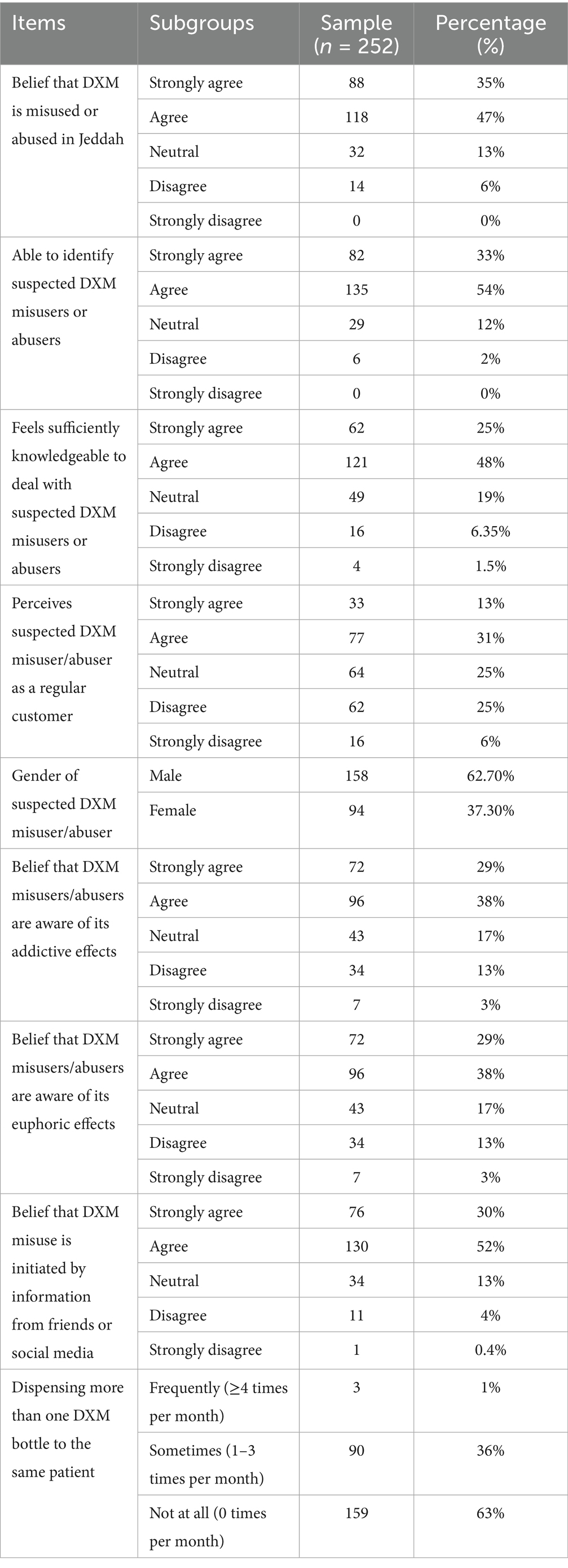 More than 110 pharmacists (43.6%) believed that misusers were regular customers, and 158 (62.7%) reported that they were predominantly male. A total of 168 (66.7%) agreed that misusers were aware of DXM’s addictive potential, and an equal number (168; 66.7%) believed misusers were conscious of its euphoric effects. Peer influence and social media exposure were cited by 206 pharmacists (81.8%) as key factors contributing to misuse, highlighting the role of informal information sources.