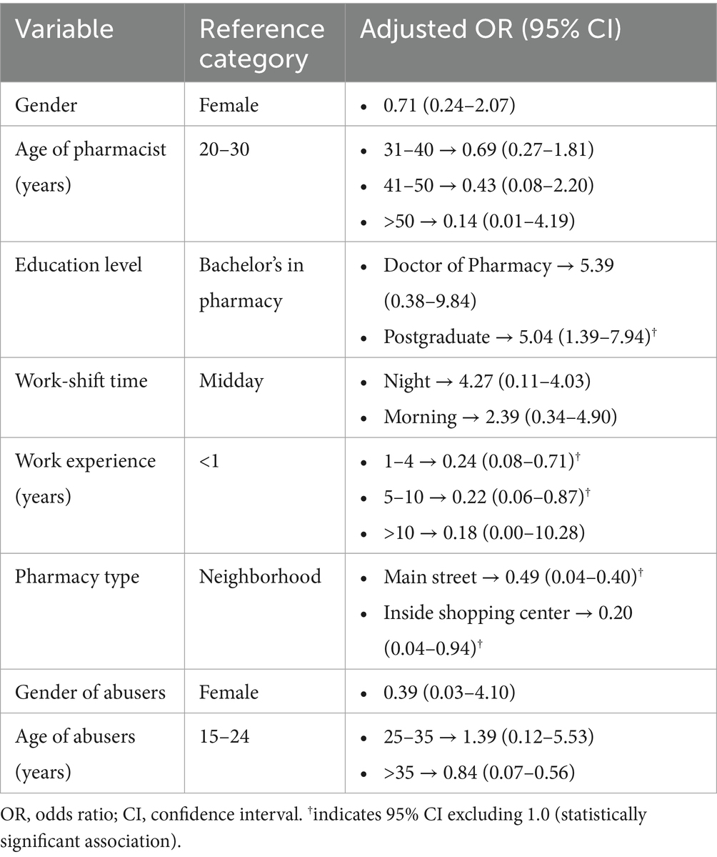 Pharmacists’ adoption of restrictive dispensing strategies was further analyzed using the second multivariate logistic regression model, with the results summarized in Table 4. Requests for non-OTC DXM products and pharmacy location were significantly associated with restrictive behaviors (OR = 1.96; 95% CI 1.08–3.54; p < 0.05). Education level, work experience, and pharmacy type also demonstrated significant associations. Pharmacists with postgraduate qualifications were more likely to implement restriction strategies than those with only a bachelor’s degree (adjusted OR = 5.04; 95% CI 1.39–7.94; p < 0.05). Conversely, those with 1–4 years or 5–10 years of experience were less likely to apply restrictions compared with pharmacists having < 1 year of experience (OR = 0.24; 95% CI 0.08–0.71 and OR = 0.22; 95% CI 0.06–0.87, respectively). Pharmacists working in main-street or shopping-center locations were also less likely to report restrictive practices than those in neighborhood pharmacies (OR = 0.49; 95% CI 0.04–0.40 and OR = 0.20; 95% CI 0.04–0.94, respectively).