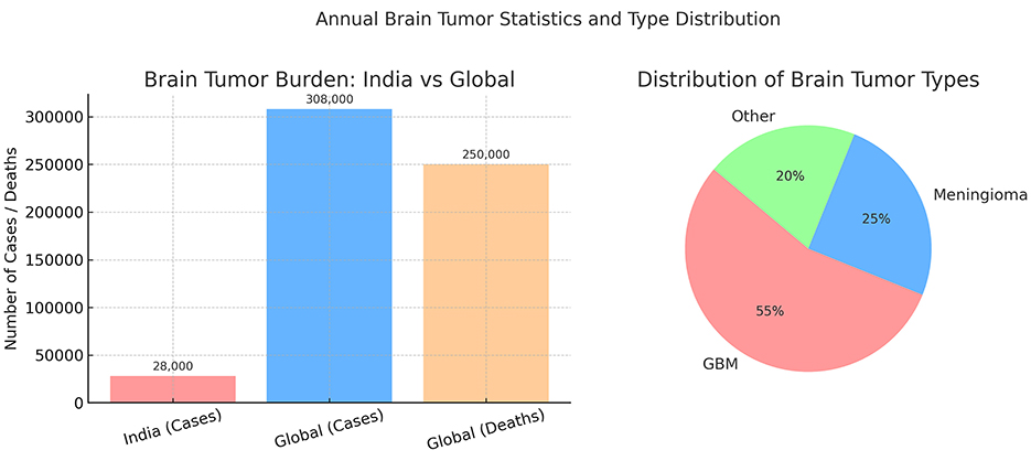Figure 1. Annual brain tumor statistics for India and worldwide, including distribution of tumor types.