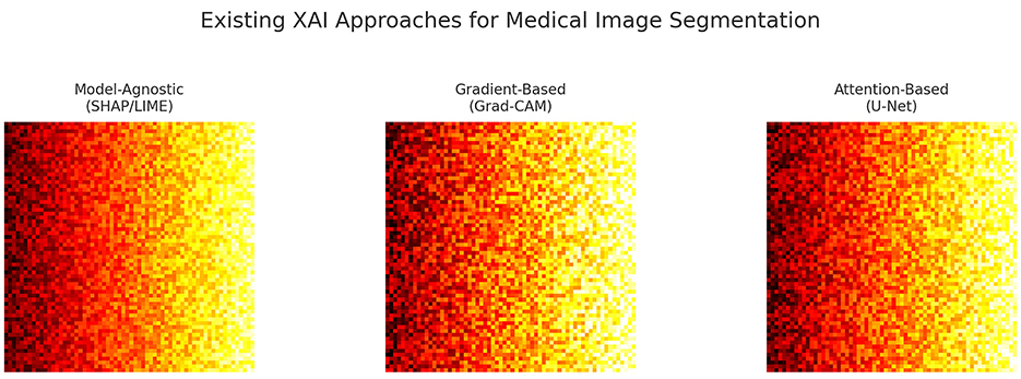 Magnetic Resonance Imaging (MRI) is the gold standard for diagnosing and characterizing brain tumors due to its excellent soft tissue contrast and multi-planar imaging capabilities. Different MRI sequences provide complementary information about tumor composition, which is essential for accurate segmentation and classification (4). T1-weighted (T1W) MRI offers detailed anatomical structure but has limited tumor contrast. T2-weighted (T2W) MRI highlights fluid-filled regions, including peritumoral edema, but lacks specificity. FLAIR (Fluid Attenuated Inversion Recovery) MRI suppresses cerebrospinal fluid (CSF) signals, making edema more distinguishable from normal brain tissue (5). T1-Contrast Enhanced (T1CE) MRI utilizes contrast agents to highlight the tumor's enhancing core, aiding in clear boundary delineation. Multi-modal fusion of these sequences is crucial for deep learning-based segmentation, as each modality provides unique tumor-related features. The BraTS dataset, a widely used benchmark for brain tumor segmentation, includes T1, T2, FLAIR, and T1CE MRI modalities to facilitate multi-modal learning (6). Despite the advantages of MRI, manual tumor segmentation is labor-intensive and prone to variability due to tumor heterogeneity in shape, size, and intensity, as well as low inter-observer agreement among radiologists. Automated segmentation using deep learning offers consistent, rapid, and accurate tumor delineation, making it a promising clinical tool. Deep learning, particularly Convolutional Neural Networks (CNNs), has achieved state-of-the-art results in medical image segmentation. The U-Net architecture (7), with its encoder–decoder structure and skip connections, remains one of the most widely used frameworks. Variants such as 3D U-Net, Attention U-Net, and Transformer-based architectures have improved contextual modeling and reduced false positives (8). Nevertheless, these models are primarily optimized for prediction accuracy and often rely on correlation-based feature attribution, which offers limited insight into the underlying decision-making process. This lack of interpretability reduces clinician trust in AI-assisted diagnostics, especially in critical applications like neuro-oncology.