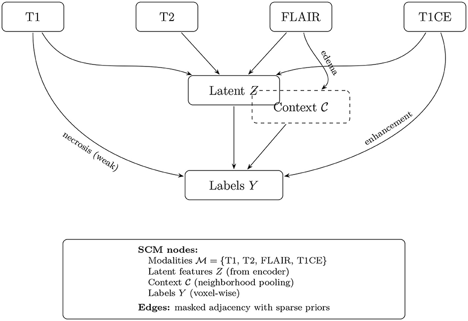 The SCM layer implements a learnable directed acyclic graph G = (V, E) where the vertex set V = {, Z, Y} represents the causal variables: modality nodes = {T1, T2, FLAIR, T1CE}, latent feature representations Z, and voxel-wise labels Y. The causal relationships are parameterized through structural equations: