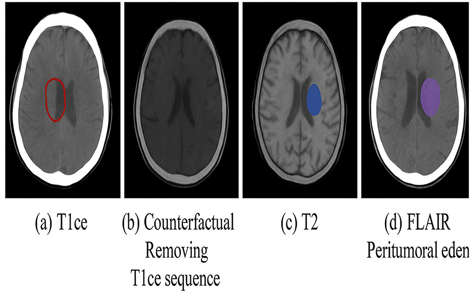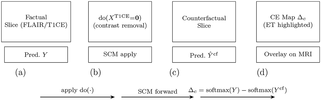 Figure 6. Counterfactual reasoning pipeline: (a) factual prediction (left), (b) intervention removing the T1CE modality via do(XT1CE = 0), (c) counterfactual prediction, and (d) resulting causal effect (CE) map. In this example, removing T1CE caused the enhancing tumor (ET) region to disappear, confirming its causal dependence on T1CE signal–an insight useful for treatment planning.