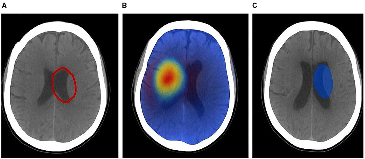Figure 7. Tumor margin refinement: (A) ground truth, (B) Grad-CAM saliency, (C) CausalX-Net CE map overlaid on T1CE. CE maps confine to true ET boundaries, reducing over-segmentation.