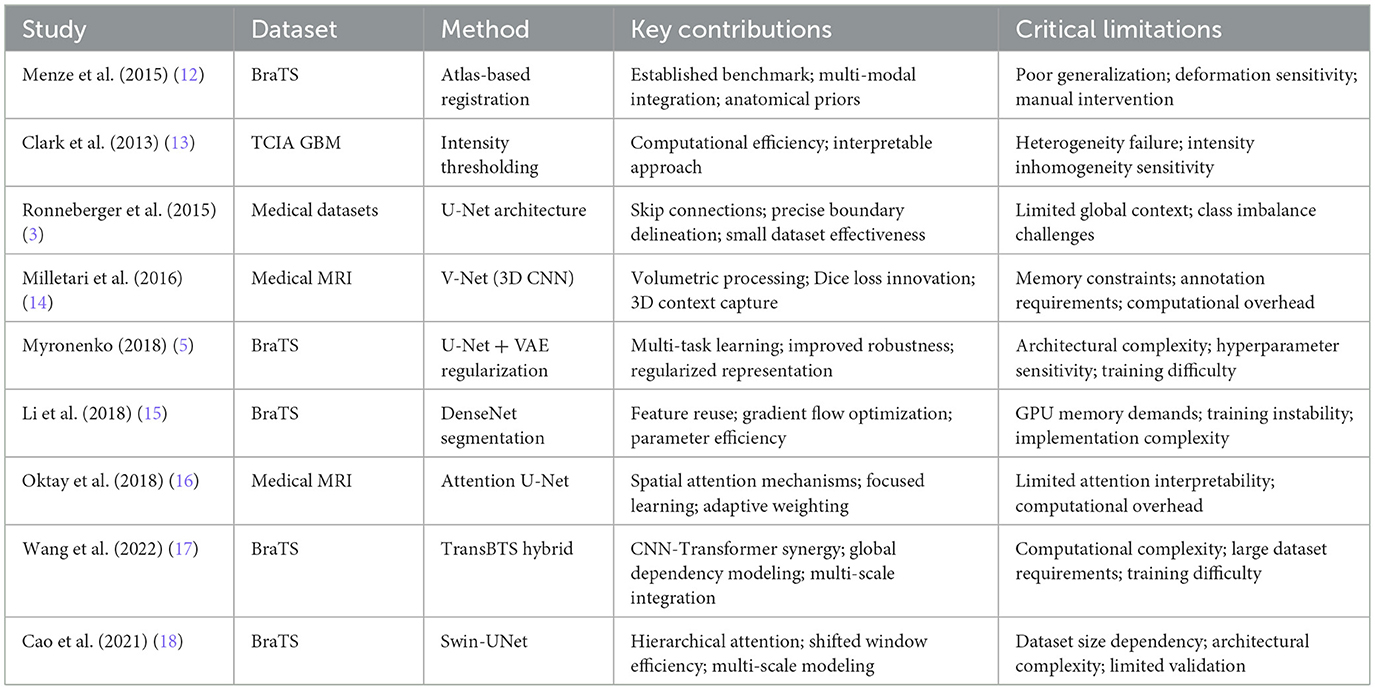 Tables 1, 2 summarize key contributions, trends, and limitations across major brain tumor segmentation paradigms. The field has evolved from conventional to deep learning-based methods, achieving substantial gains in automation and accuracy at the expense of computational cost and interpretability. Classical techniques (thresholding, region growing, atlas-based) (12, 13) offered efficiency and transparency but failed on heterogeneous tumors, intensity inhomogeneity, and partial volume effects. CNN-based models (3, 5, 14–16) introduced automated feature learning, skip connections, dense connectivity, and attention, delivering strong performance but suffering from high computational demands, limited receptive fields, and reduced explainability. 3D extensions improved volumetric context modeling yet further increased resource requirements.