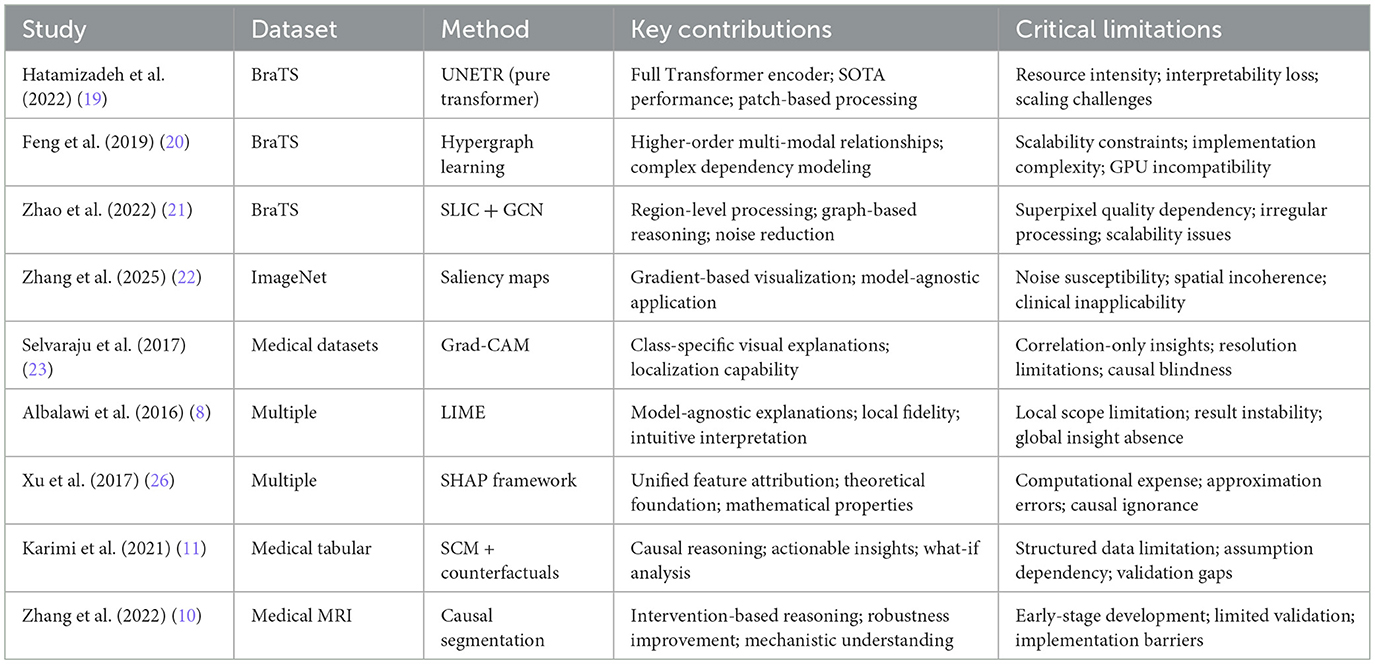Interpretability methods remain the widest gap: gradient-based saliency (22), Grad-CAM (23), and model-agnostic methods [LIME (24), SHAP (26)] provide only correlation-level insights, insufficient for clinical decision-making. Causal inference approaches (9–11) promise mechanistic understanding and robustness but remain early-stage, with limited validation and scarce interventional data.