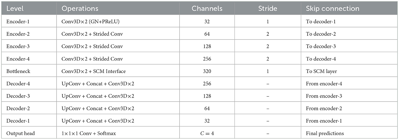 The segmentation backbone adopts a 3D U-Net-inspired encoder-decoder architecture with modern architectural improvements for enhanced feature learning and gradient flow. The detailed configuration is provided in Table 3, which specifies the layer-wise operations, channel dimensions, stride parameters, and skip connection arrangements.