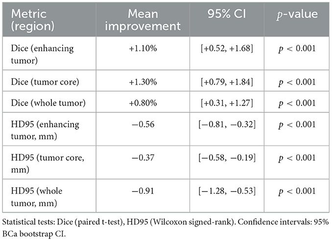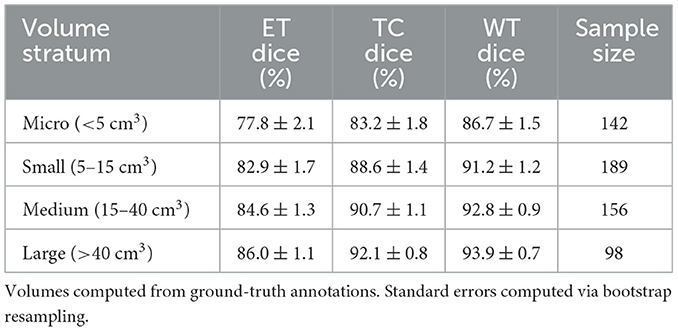 The narrow confidence intervals and highly significant p-values shown in Table 4 indicate consistent, reproducible improvements across the test cohort. The 14%–18% reduction in HD95 distances represents a substantial enhancement in boundary localization accuracy, critical for radiotherapy planning applications. To assess performance consistency across tumor heterogeneity, we conducted a stratified analysis by lesion volume, revealing maintained efficacy across the complete size spectrum. The detailed performance breakdown by volume strata is presented in Table 5.