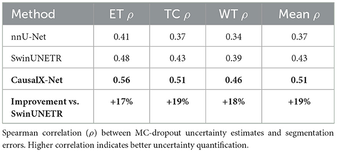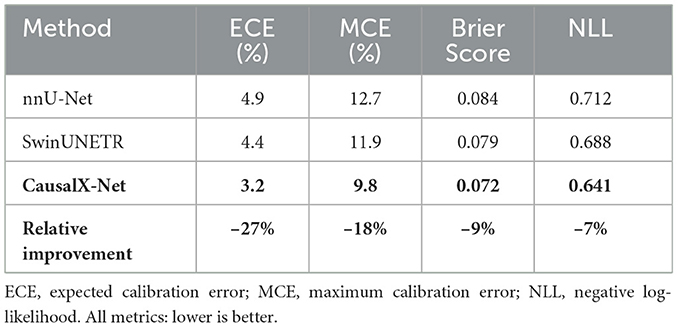 As evident from Table 5, performance scales positively with lesion size, indicating that causal reasoning provides particular benefits for challenging micro-lesions where traditional methods struggle. The 9.8% improvement in ET Dice for micro-lesions suggests enhanced sensitivity for small enhancing components. Well-calibrated probability estimates are essential for clinical decision-making and risk assessment. CausalX-Net demonstrates superior calibration across multiple metrics, as comprehensively evaluated in Table 6.