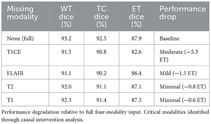 During training, we implement a comprehensive augmentation strategy that includes: (i) 3D spatial transformations (rotations up to ±15°, elastic deformations with displacement fields), (ii) intensity perturbations (Gaussian noise, gamma correction, intensity scaling), and (iii) modality dropout, where individual modalities are randomly ablated to probe causal robustness and prevent over-reliance on specific imaging sequences. This modality dropout strategy is particularly crucial for training the SCM to handle missing modalities and understand causal dependencies between different imaging contrasts as shown in Figure 4.