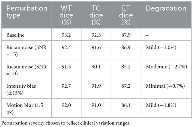 Table 8 reveals that CausalX-Net exhibits graceful degradation under perturbations, with T1CE identified as the most critical modality for ET segmentation (5.3% performance drop when absent). As demonstrated in Table 9, the model maintains >90% baseline performance under realistic noise levels (SNR = 15), indicating clinical viability. Precise boundary delineation is critical for radiotherapy planning and surgical guidance. We assess boundary fidelity using multiple complementary metrics, with comprehensive results presented in Table 10.