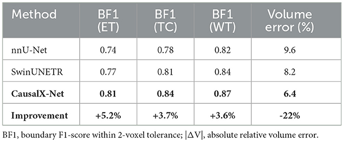 The results in Table 10 demonstrate a 22% reduction in volumetric error and consistent boundary F1 improvements, translating to more accurate target volume delineation for treatment planning, potentially reducing both under-treatment and over-treatment risks. Systematic error analysis reveals specific failure patterns and demonstrates the utility of causal explanations for model auditing.