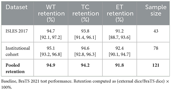 Causal audit results: counterfactual analysis using do(FLAIR = 0) intervention correctly identified 81% of edema over-segmentation errors, demonstrating the diagnostic value of causal explanations. Uncertainty-based triage of the top 10% most uncertain voxels captured 62% of ET segmentation errors, enabling efficient quality control workflows. Cross-dataset evaluation assesses model generalizability beyond the training distribution using ISLES 2017 and institutional cohort data. The comprehensive generalization analysis is presented in Table 11. Table 11 demonstrates >90% performance retention across external datasets, with confidence intervals indicating reliable cross-institutional applicability.