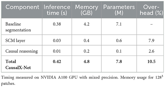 Practical deployment requires computational efficiency compatible with clinical timelines. The detailed computational analysis is provided in Table 12. Table 12 shows minimal computational overhead (10.5%), demonstrating that causal reasoning capabilities can be integrated without compromising clinical workflow efficiency. Sub-second inference times enable real-time interactive applications.
