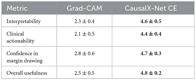 Figure 7 illustrates a typical case where standard Grad-CAM saliency maps highlight a broad region around the lesion, while CausalX-Net CE maps sharply delineate the enhancing tumor boundary. Across all 30 cases, CE maps improved boundary agreement with ground truth contours (Dice of manual vs. assisted contours: 0.86 vs. 0.79, p < 0.001) and reduced inter-rater variability (Hausdorff 95th percentile: 2.9 mm vs. 4.1 mm). Radiologists reported that CE maps particularly helped separate enhancing tumor from surrounding edema in heterogeneous lesions.