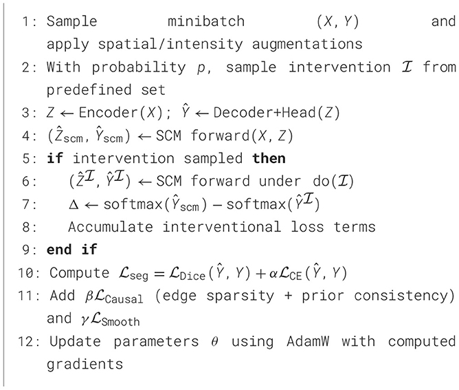 Interventional training strategy: during each minibatch, we sample interventions with probability p = 0.2 and perform joint backpropagation through both factual and interventional forward passes. This strategy ensures that the model learns to maintain segmentation accuracy while developing robust causal reasoning capabilities. The complete training procedure is detailed in Algorithm 1, which outlines the step-by-step process including intervention sampling, SCM forward passes, and loss computation.