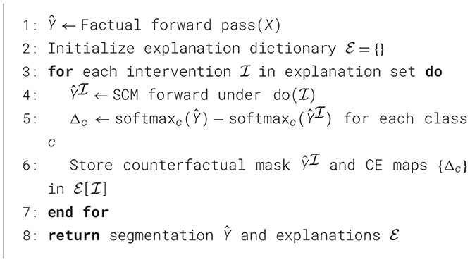 Inference procedure: standard inference performs a single factual forward pass to obtain segmentation predictions Y. For explanation generation, we execute a selected set of interventions to compute CE maps, balancing computational cost with explanation comprehensiveness. The inference process with causal explanation generation is outlined in Algorithm 2, which demonstrates how counterfactual masks and causal effect maps are systematically computed and stored for clinical interpretation.
