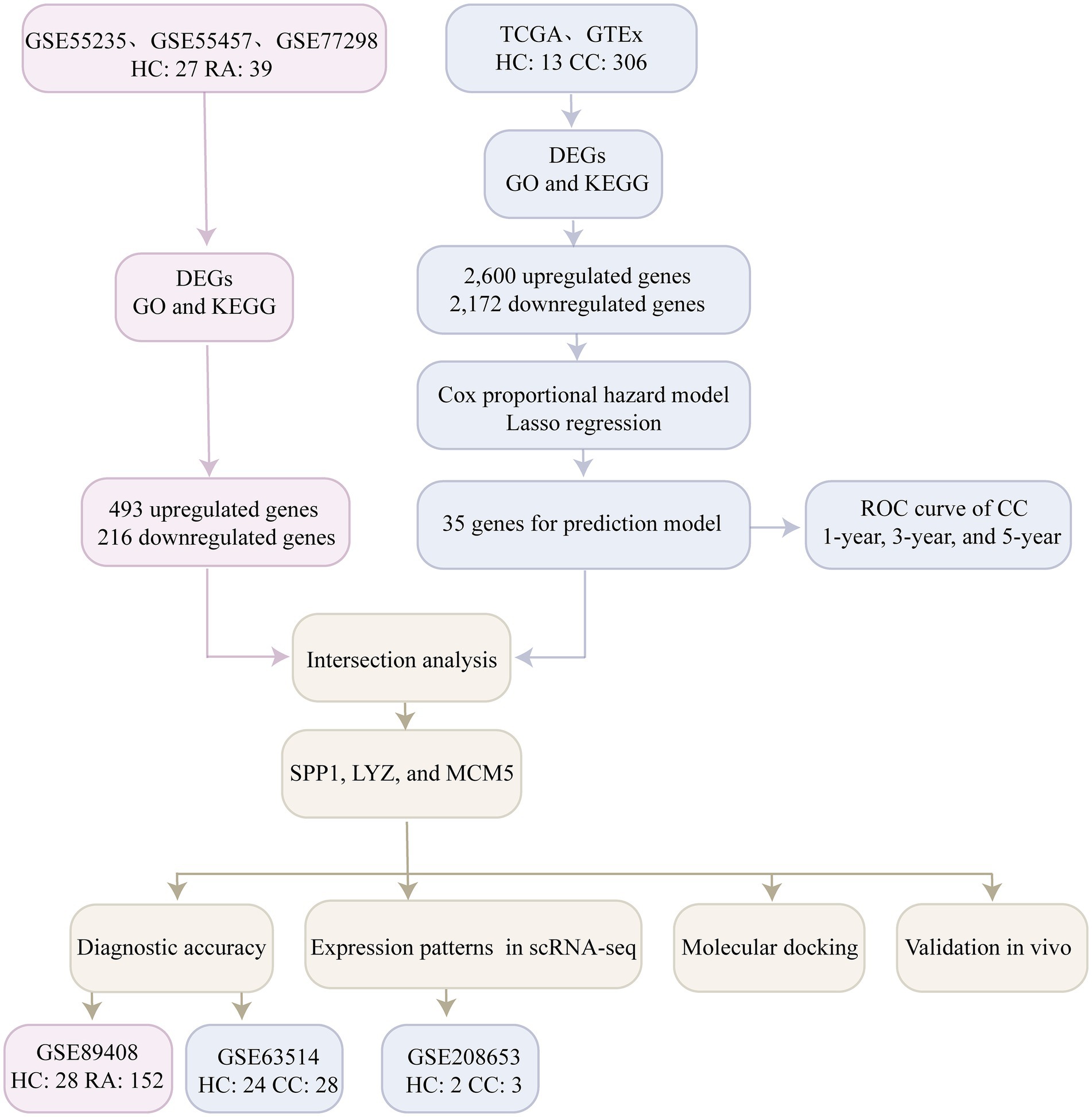 Figure 1. Flowchart illustrating the main methods of the current study. Healthy controls, HC; Rheumatoid arthritis, RA; Cervical cancer, CC; Differentially expressed genes, DEGs; Receiver operating characteristic curve, ROC; Gene ontology, GO; Kyoto Encyclopedia of Genes and Genomes, KEGG; Single cell RNA Sequencing, scRNA-seq.