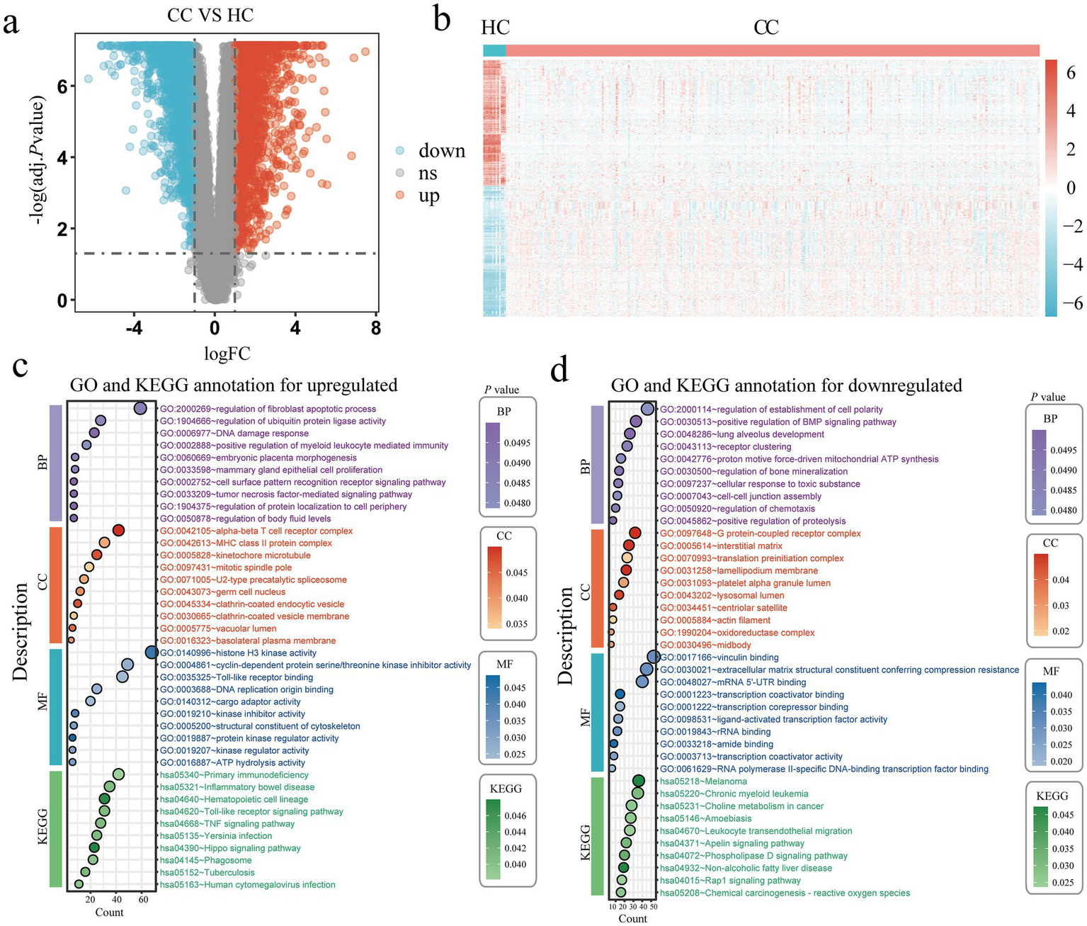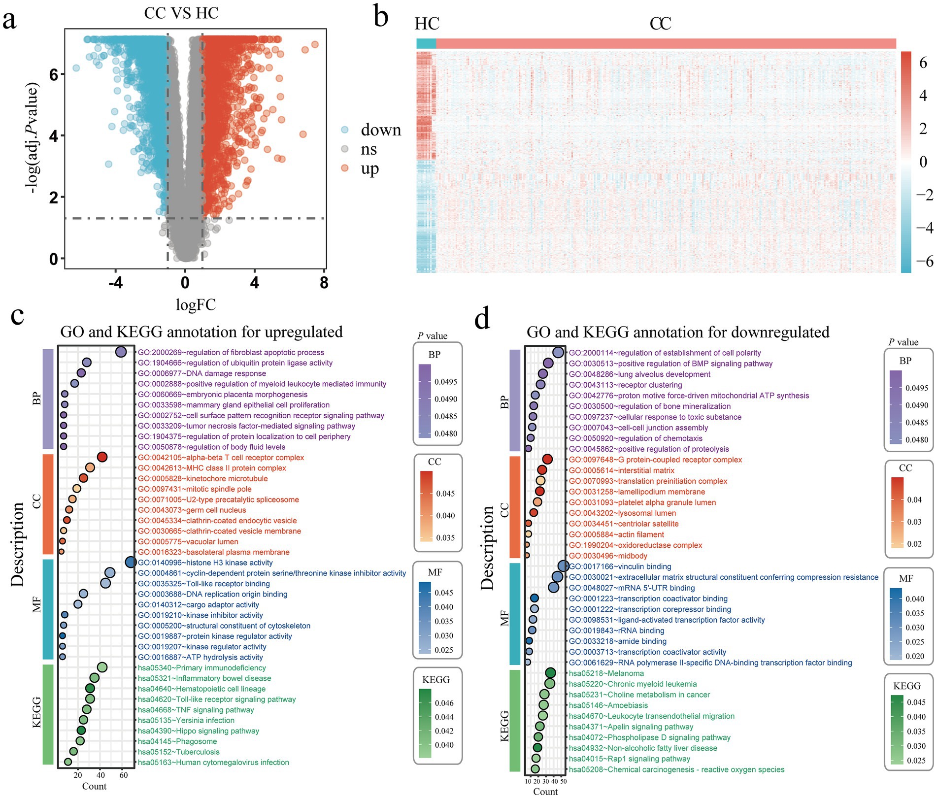 Figure 3. Identification of DEGs in cervical cancer. (a) Volcano plots of every DEG in the GTEx and TCGA; red denotes upregulated DEGs and blue denotes downregulated DEGs. (b) A heatmap of the top DEGs in the TCGA and GTEx. (c,d) The enrichment analysis results of GO and KEGG pathway in upregulated (c) and downregulated (d) DEGs. Healthy controls, HC; Cervical cancer, CC; Differentially expressed genes, DEGs; Gene ontology, GO; Kyoto Encyclopedia of Genes and Genomes, KEGG.
