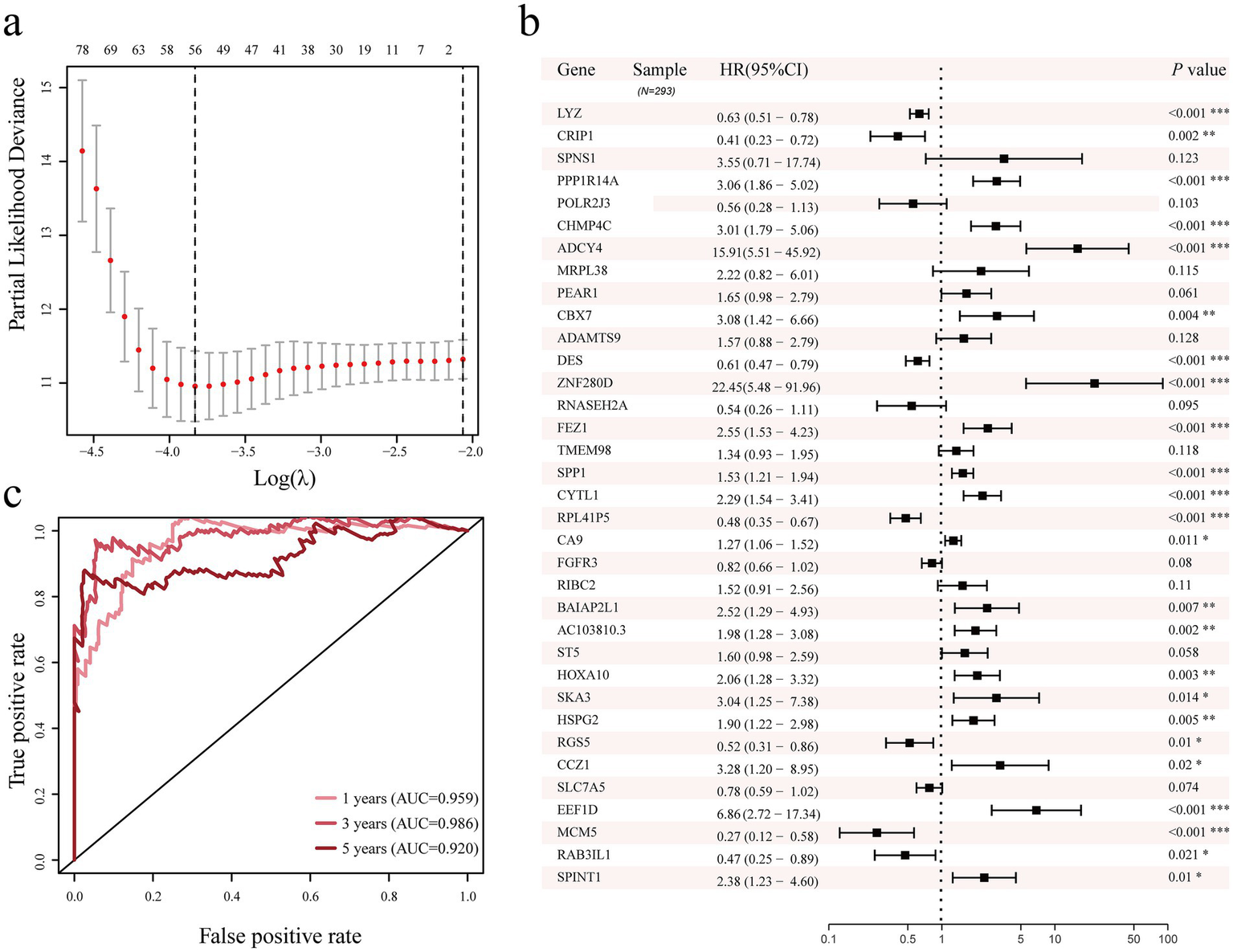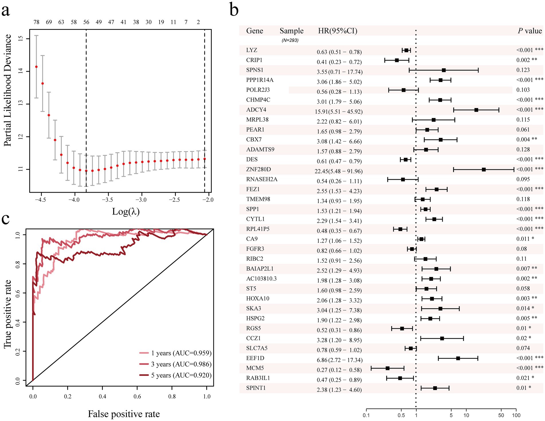 Figure 4. Lasso regression, univariate and multivariate Cox proportional models were used to identify genes associated with the prognosis of cervical cancer. (a) LASSO regression analysis of genes related to prognosis of cervical cancer. (b) Screening of genes related to prognosis of cervical cancer using multivariate Cox proportional model. (c) Analysis of the 1-year, 3-year, and 5-year prediction ability of the 35 genes cervical cancer prediction model. Area Under Curve, AUC.