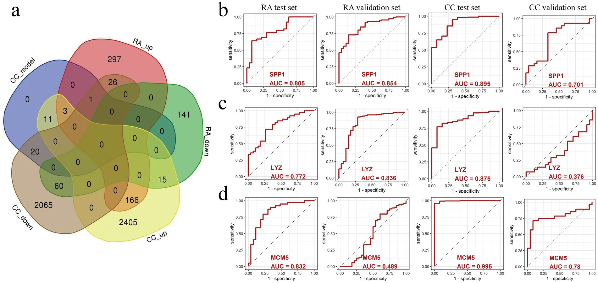 Figure 5. The predictive value of SPP1, LYZ, and MCM5 in relation to cervical cancer and rheumatoid arthritis (RA) was examined using a ROC curve. (a) The intersection of genes that are expressed differently in cervical cancer and RA. (b) ROC curves for evaluating the predictive value of SPP1 in the RA test dataset, RA validation dataset, cervical cancer test dataset, and cervical cancer validation dataset. (c) ROC curves for evaluating the predictive value of LYZ in the RA test dataset, RA validation dataset, cervical cancer test dataset, and cervical cancer validation dataset. (d) ROC curves for evaluating the predictive value of MCM5 in the RA test dataset, RA validation dataset, cervical cancer test dataset, and cervical cancer validation dataset. Healthy controls, HC; Rheumatoid arthritis, RA; Cervical cancer, CC; Area Under Curve, AUC.