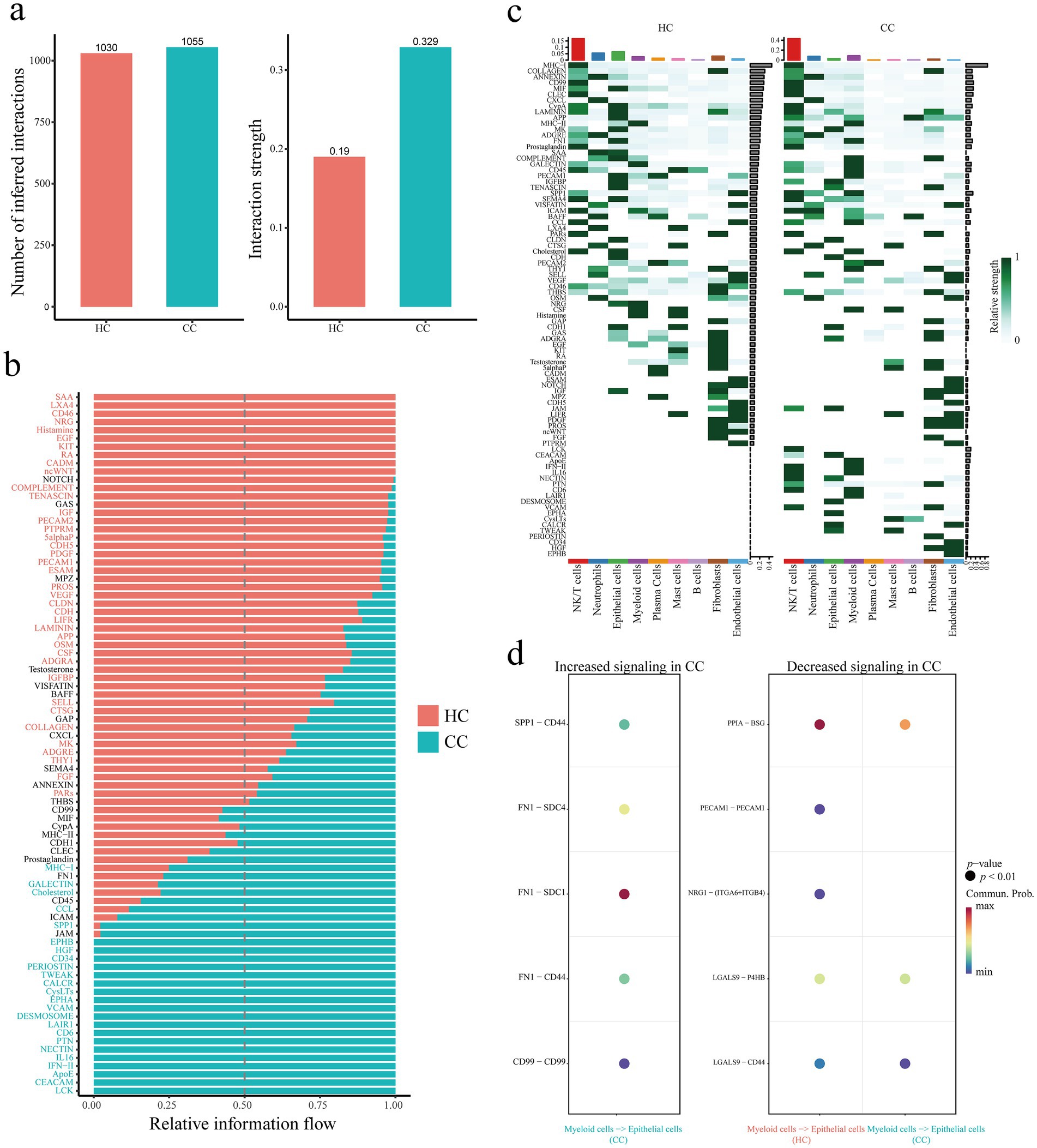 Figure 8. Single cell transcriptomic analysis of cellular communication in cervical cancer. (a) Comparison of the number and strength of inferred interactions between the control and cervical cancer groups. (b) Comparison of signal pathway enrichment between healthy control group and cervical cancer group. (c) Comparison of signaling pathway enrichment in each cell population between the healthy control group and the cervical cancer group. (d) Using Myeloid cells as ligands and Epithelial cells as receptors, compare the differences in ligand receptor pairs between the healthy control group and the cervical cancer group. Healthy controls, HC; Cervical cancer, CC; Single cell RNA Sequencing, scRNA-seq.