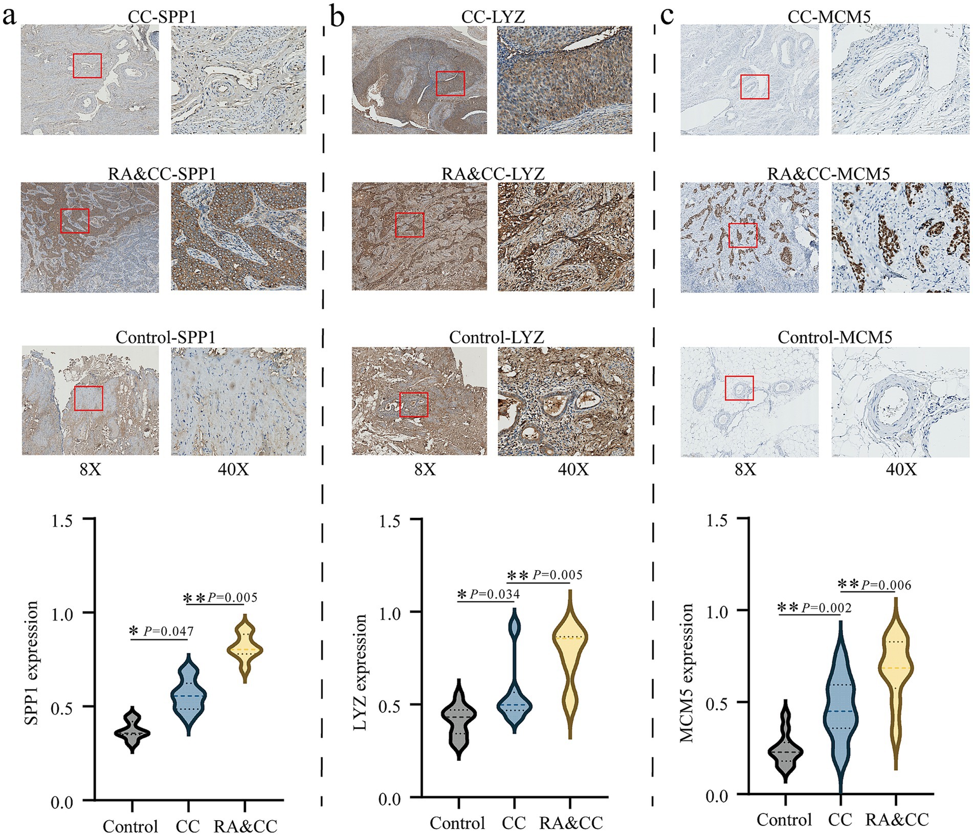 Figure 9. Immunohistochemistry analysis of the differential expression of SPP1, LYZ, and MCM5 in rheumatoid arthritis combined with cervical cancer patients and cervical cancer patients. (a) Analysis of SPP1 expression in the groups with cervical cancer, rheumatoid arthritis combined with cervical cancer, and healthy control group. (b) Analysis of LYZ expression in the groups with cervical cancer, rheumatoid arthritis combined with cervical cancer, and healthy control. (c) Analysis of MCM5 expression in the groups with cervical cancer, rheumatoid arthritis combined with cervical cancer, and healthy control. *p < 0.05, **p < 0.01. Healthy controls, HC; Rheumatoid arthritis, RA; Cervical cancer, CC.