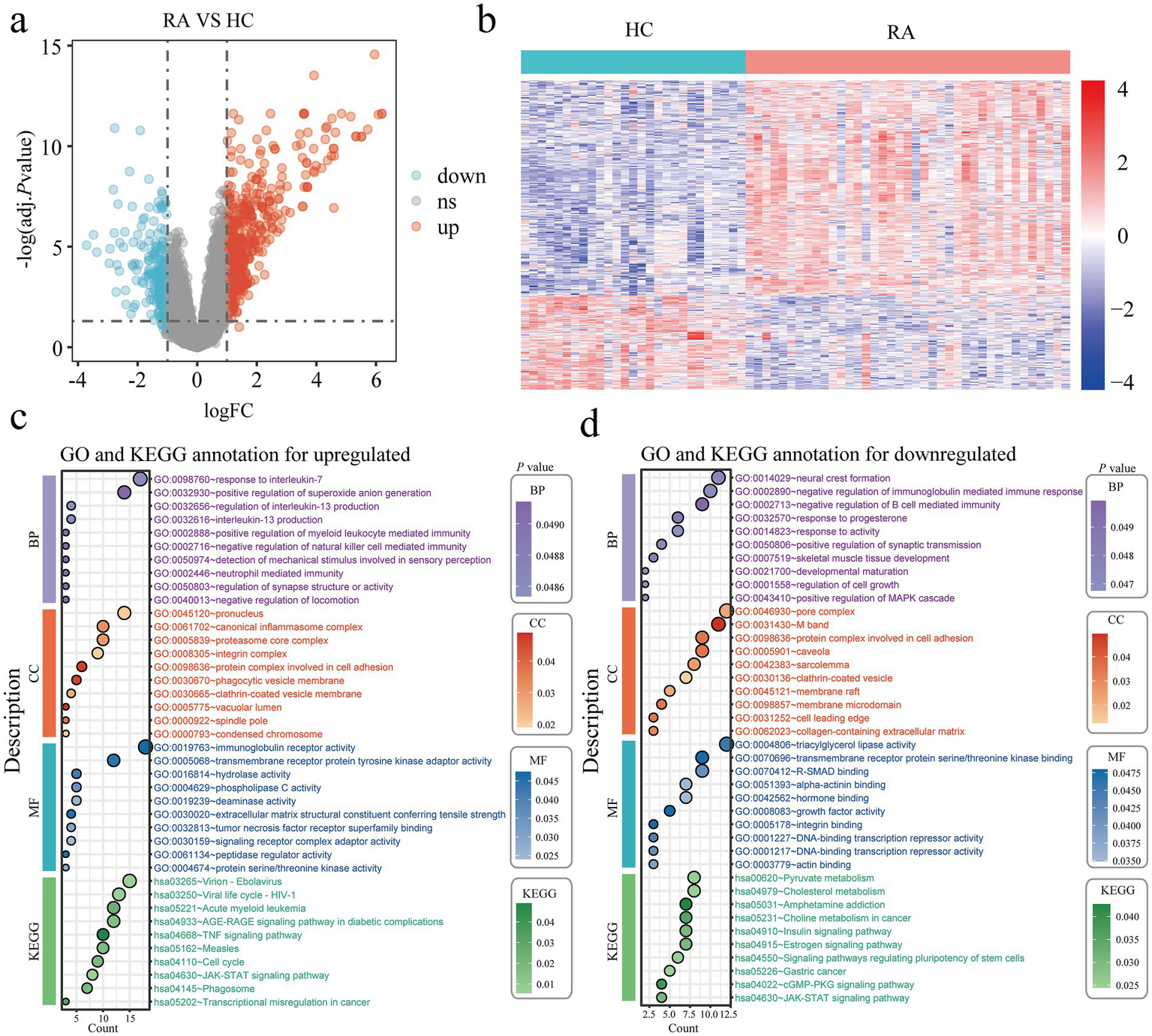 Figure 2. Identification of DEGs in rheumatoid arthritis patients. (a) Volcano plots of all DEGs in the integrated GSE55235, GSE55457, and GSE77298, upregulated DEGs are indicated by red, while downregulated DEGs are indicated by blue. (b) In the integrated GSE55235, GSE55457, and GSE77298 heatmap, the top DEGs are displayed. (c,d) The findings of the KEGG and GO enrichment analyses in upregulated (c) and downregulated (d) DEGs. Healthy controls, HC; Rheumatoid arthritis, RA; Differentially expressed genes, DEGs; Gene ontology, GO; Kyoto Encyclopedia of Genes and Genomes, KEGG.