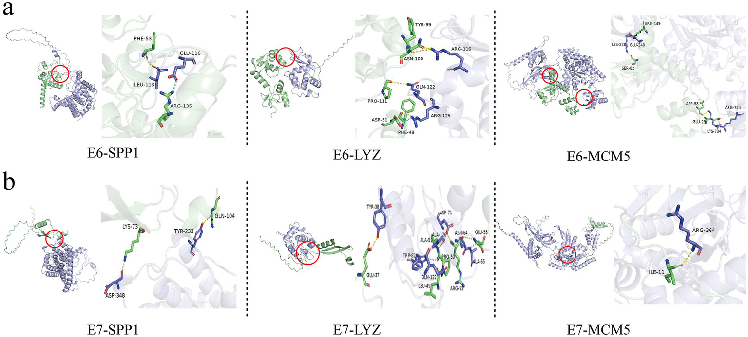 Figure 6. Molecular docking simulation between the proteins encoded by three candidate genes, SPP1, LYZ, and MCM5, and HPV16 E6/E7 viral proteins. (a) Molecular docking simulation between the proteins encoded by three candidate genes, SPP1, LYZ, and MCM5, and HPV16 E6 viral protein. (b) Molecular docking simulation between the proteins encoded by three candidate genes, SPP1, LYZ, and MCM5, and HPV16 E7 viral protein.