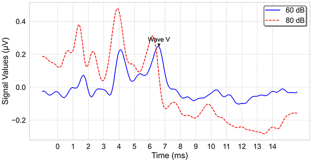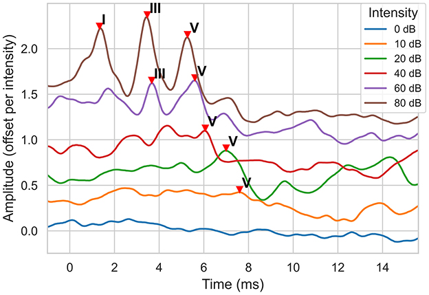 Auditory Brainstem Response (ABR) test is a widely used electrophysiological test method for detecting hearing loss, especially in infancy and individuals who cannot cooperate with behavioral tests (1). ABRs are recorded non-invasively via scalp electrodes and reflect the bioelectric activity of specific components of the auditory pathway following an auditory stimulus (2). Its clinical value lies in the objective assessment of hearing thresholds and functional integrity of the auditory system (3). An ABR signal has a typical structure with 7 positive waves. Three known waves (I, III, and V) are more prominent and therefore clinically the most useful (4). These waveforms are typically labeled through visual inspection. The lowest intensity level at which wave V can be observed gives the hearing threshold. An example is shown in Figure 1. The figure shows the ABR signals for six different intensity levels. The lowest intensity level where wave V is observed is 10 dB, indicating the hearing threshold of the ear.