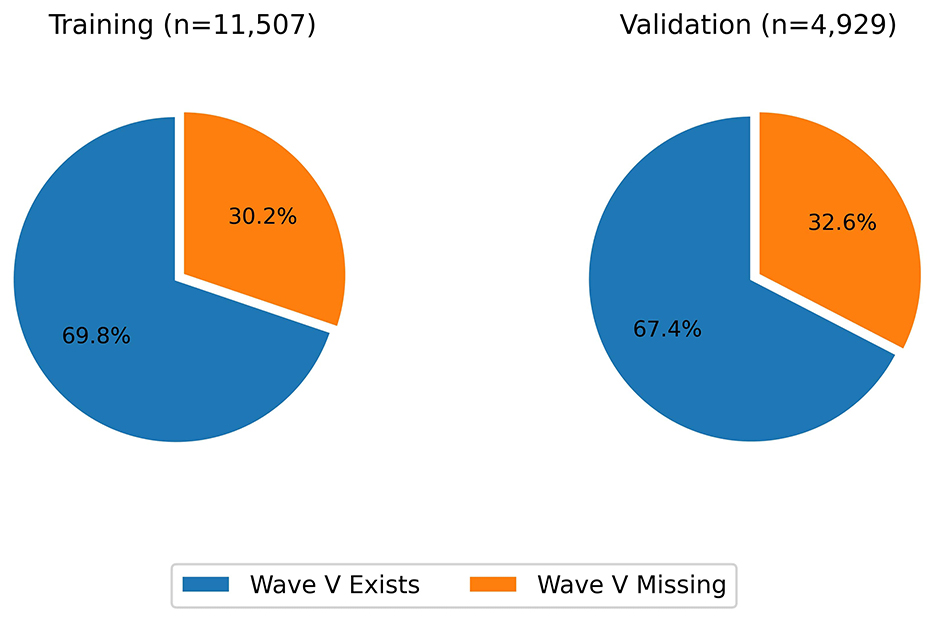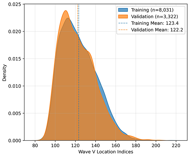 The dataset was then split into 70% training and 30% validation sets, preserving the ratio of wave V absence and presence. The split was done based on the ear; that means, it was ensured that signals from an ear are either in the training set or the testing set during the split. The final distributions with respect to the presence of wave V and with respect to the wave V positions are shown in Figures 3, 4, respectively.