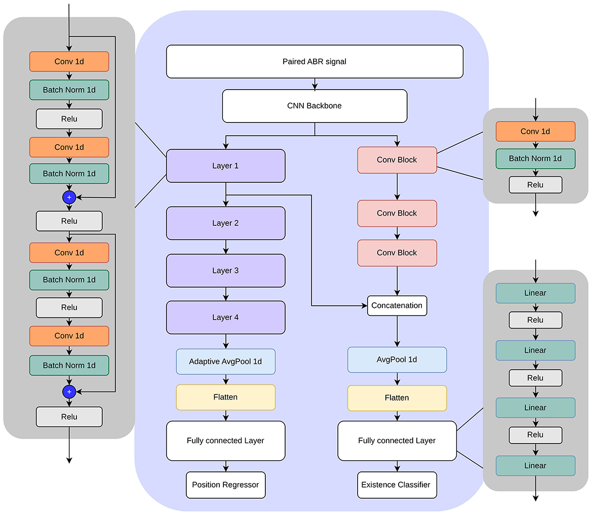 In this study, we investigated convolutional neural networks (CNNs) (15) for simultaneous classification of wave V existence and regression of its latency in ABR signals. Our design process was iterative, starting with a simple 1D CNN and progressing toward a more advanced architecture that includes ResNet (16) blocks to improve performance and robustness. The final design is shown in Figure 5. The design includes a CNN backbone, followed by a regressor for wave V location and a classifier for wave V existence. The regressor head essentially has four ResNet-like layers. Each layer has a combination of convolution, batch normalization, and ReLU layers with skip connections. The standard residual blocks are modified to include temporal dilation rates of 2, 4, and 8, enabling multiscale feature extraction over varying latency spans. An adaptive average pooling layer is applied after the final residual block to aggregate temporal features before a fully connected layer.