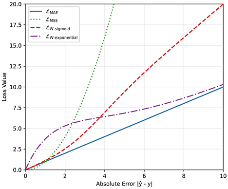 with m and k being some scalar values. The behaviors of these functions (, , , ) are plotted in Figure 6 for m = 3 and k = 0.5. In the case of , the function behaves similarly to the MAE loss for small deviations, but for large deviations, it penalizes more than the MAE loss. The exponential loss has the opposite behavior: It penalizes more than the MAE loss when the deviation is small, but behaves like the MAE loss as the deviation gets larger.