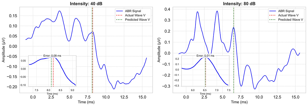 Figure 7. Example model predictions for a low and a high intensity ABR signal. Each plot includes the zoomed-in region of Wave V. Ground-truth Wave V latency is marked with a red vertical line; model prediction is shown in green.