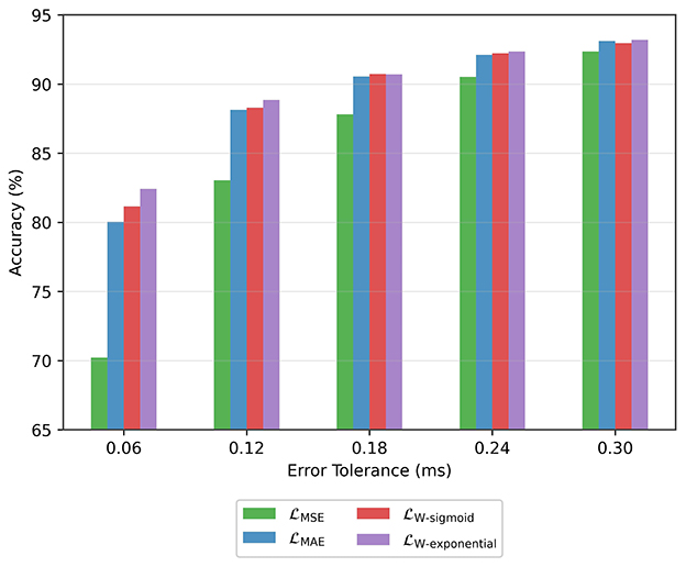 On the regression head of the model, we investigated the use of alternative loss functions. The accuracy results for different tolerance values are shown in Figure 8. In all cases, the MSE loss leads to the worst performance. The MAE loss provides marked improvement over the MSE loss, especially in the low error tolerance scenarios (i.e., 0.06 ms and 0.12 ms). The best performance overall is achieved with the weighted loss that uses an exponential function and behaves somewhere between MSE and MAE loss as shown in Figure 6.