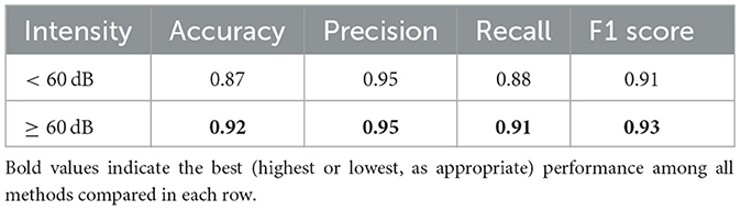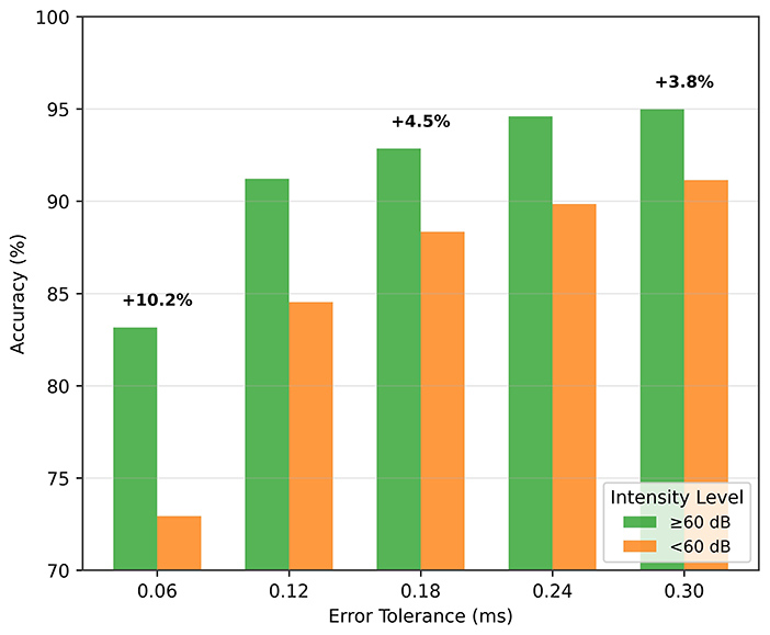 As the stimulus volume decreases, wave V becomes more difficult to detect in the ABR signal. In the previous section, we reported results without making any distinction of the stimulus intensity. Here, we analyze the performance of low-intensity and high-intensity groups. We divided the test data into two groups, namely, high intensity (≥60 dB) and low intensity (< 60 dB) groups. Figure 9 shows the wave V localization results; as expected, the accuracy is significantly higher for the high-intensity group. A similar trend is also observed for the classification performance, as shown in Table 7.