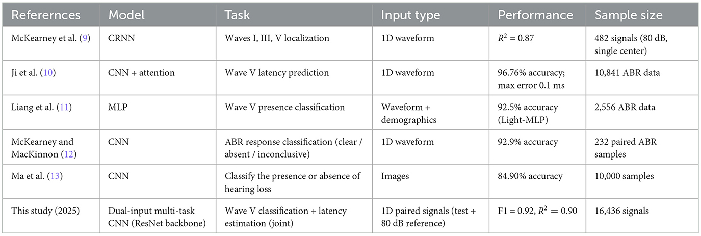 Some other studies are designed to detect whether a wave (commonly, wave V) exists in an ABR signal. In (11), the so-called Wide&Deep and Light-MLP models, which use time-domain and frequency-domain features and incorporate demographic variables such as age, sex, and pure-tone thresholds, are used to detect the existence of wave V. The Wide&Deep model achieved a classification accuracy of 91.0%, while the Light-MLP model achieved 95.4%. Another study used a deep convolutional neural network to classify ABR waveforms into “clear response”, “inconclusive”, or “response absent”, achieving 92.9% accuracy along with high sensitivity and specificity on a public dataset (12). In (13), a convolutional neural network (CNN) based model is applied to standardized ABR waveform images to classify hearing loss, achieving 85% accuracy and contributing to earlier detection with improved diagnostic efficiency and objectivity (13). In (14), computer vision based approach is taken to detect Waves I, III, and V from ABR waveform images.