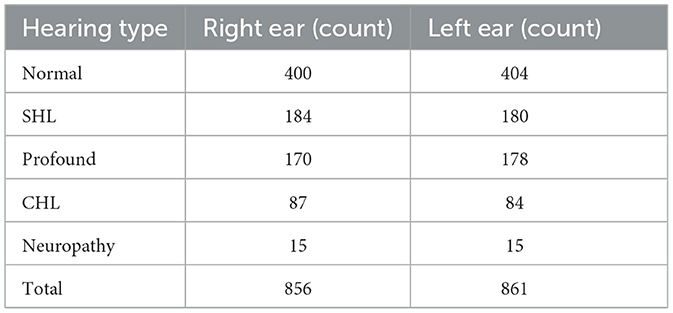 Our dataset comprises recordings from 934 patients (609 male, 325 female), including 1,717 ears. The type of hearing was classified into five groups: normal hearing, sensorineural hearing loss (SHL), profound hearing loss, conductive hearing loss (CHL), and neuropathy. Table 2 summarizes the overall distribution.