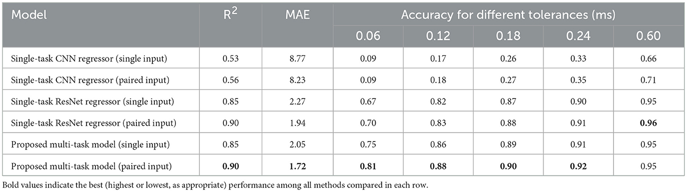 The regression results are shown in Table 4 (The regression loss function used for the results in this table is the weighted squared error with exponential decay). Three different models are evaluated. For each model, single-input and paired-input versions are trained and tested. For each model, it is seen that the paired-input version produces better R2 and MAE results compared to the single-input version, supporting the hypothesis that the use of multiple ABR signals helps to distinguish the locations of the waves. Regarding the accuracy for different tolerances, it is observed that the paired-input versions provide more gains for smaller tolerances.